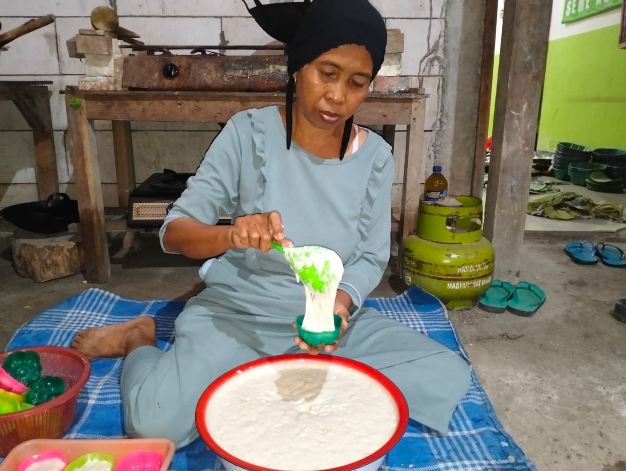 Kami ditugasi memarut kelapa tua satu buah yang sudah dikupas bersih putih. Setelah itu emak menyampurkan 1,5kg tepung beras, 1,5kg tepung terigu, 500gr gula pasir dan pengembang yang sudah larut ke dalam bak besar. Hasil parutan kami juga ikut dicampur bersama air sedikit demi sedikit sampai adonan menjadi kental mirip adonan martabak manis atau terang bulan.