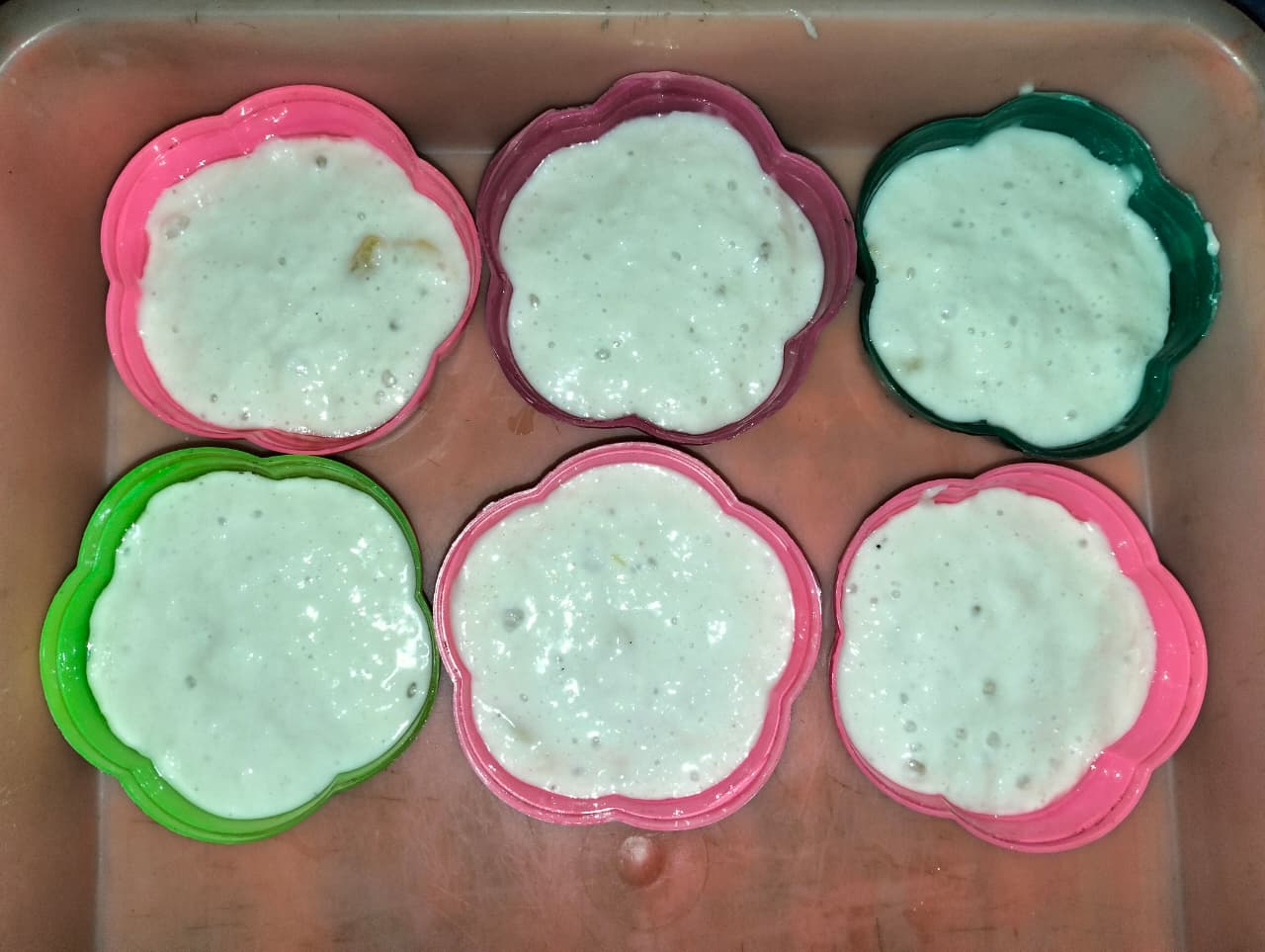 Setelah mengembang, kami memanaskan kukusan dan mengolesi cetakan apem berdiameter 6,5cm dengan minyak goreng agar adonan nantinya tidak lengket sehingga mudah dikeluarkan. Kami memasukkan adonan ke cetakan kira-kira 3/4nya.