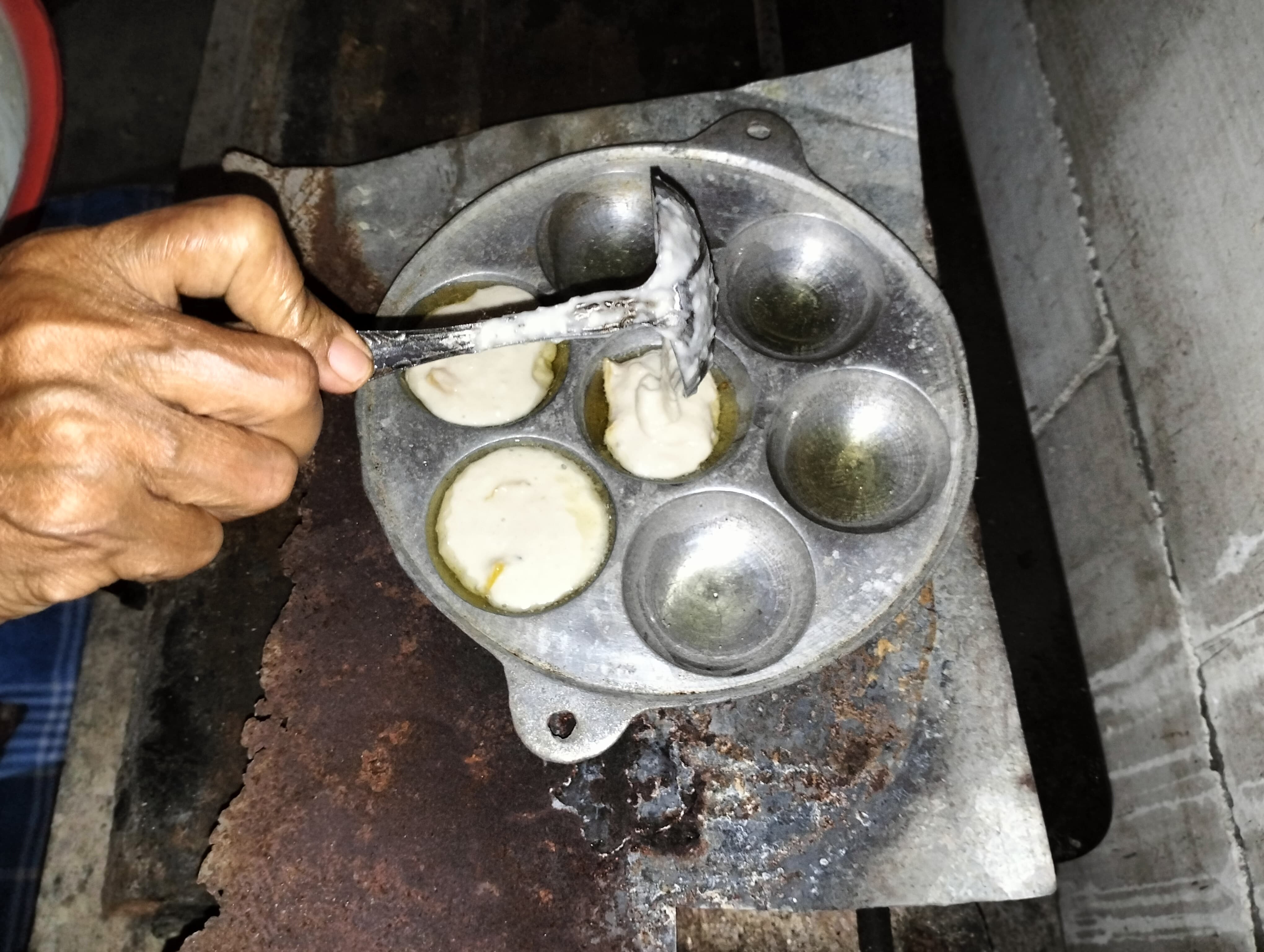 Kami beri sedikit minyak di tiap lubang. Saat sudah panas, adonan kami tuang. Jika sudah agak kering, adonan kami balik dan tunggu hingga matang. Aroma apem yang dipanggang lebih kuat dari pada yang dikukus. Dari segi rasa, apem panggang lebih legit dan gurih. Tekstur luarnya garing tapi tetap lembut di dalam.