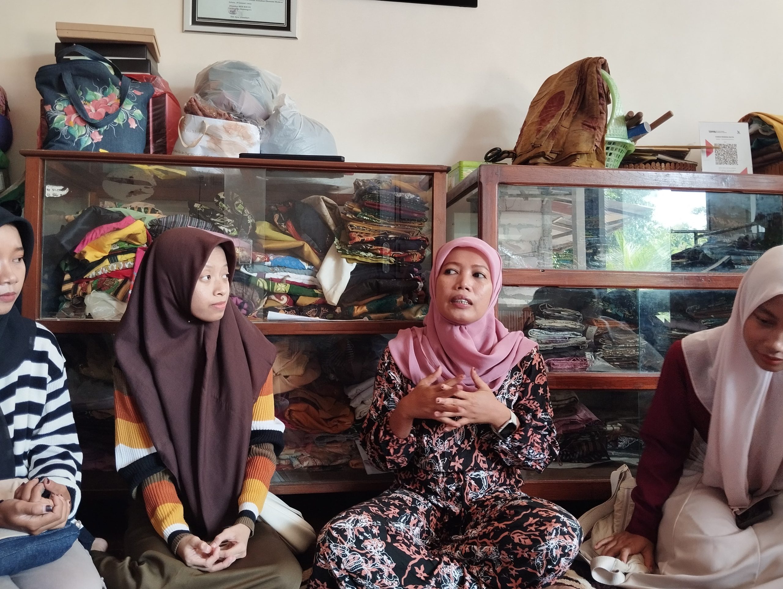Sepanjang perjalanan dengan motor, angin semili terasa menepuki kulit. Butuh waktu kurang lebih sekitar 13 menit dari Jembatan Sosrodilogo untuk sampai lokasi. Lokasi batik ecoprint milik Nurul Kholifah ini berada perkampungan padat. Sesampai di lokasi, kami disuguhi pemandangan model kain batik berbagai motif dan warna-warna yang terlihat indah dan memikat.
