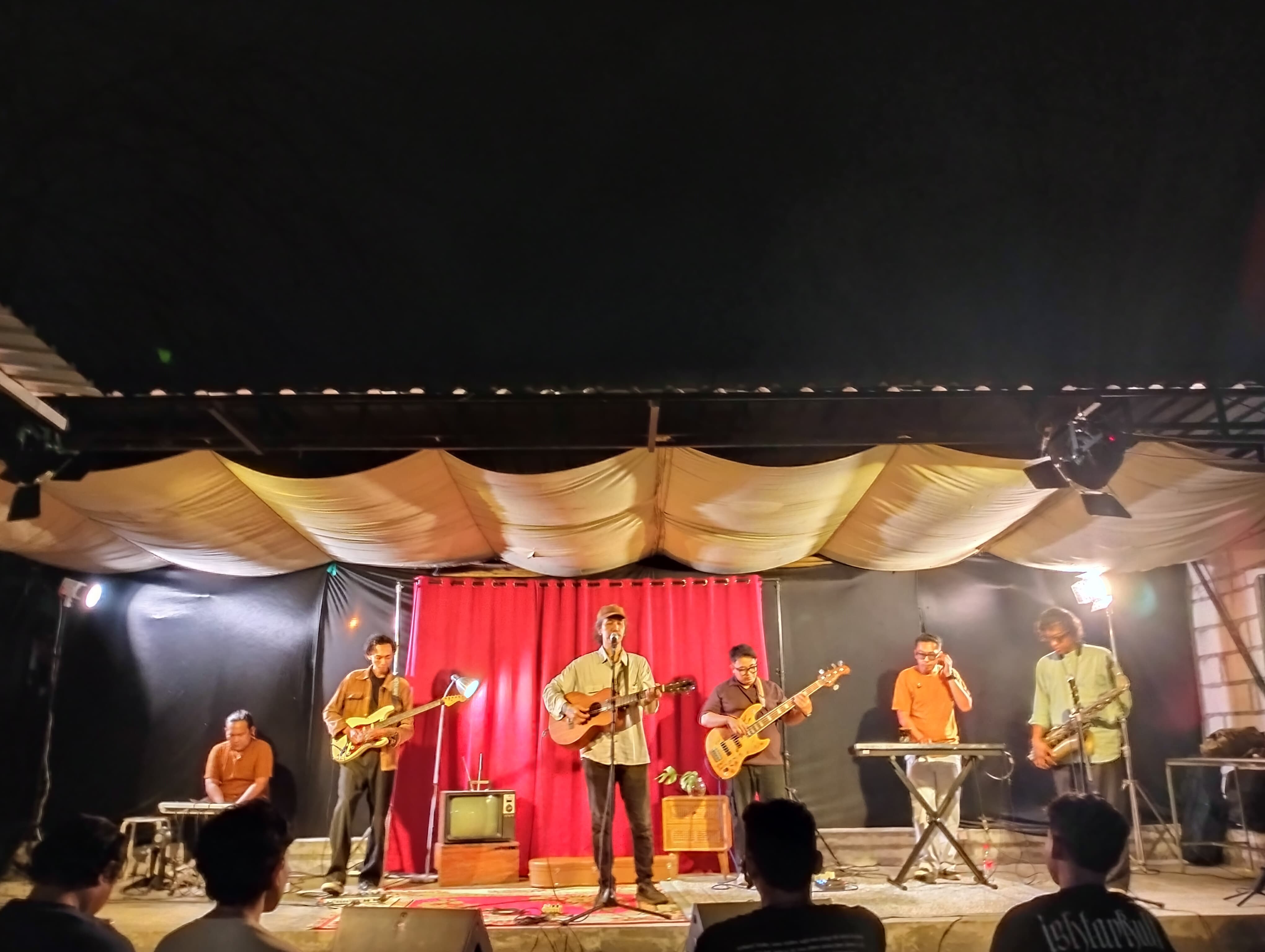 Panggung disetting sederhana dengan alas karpet dan tv tua sebagai pemercantik dengan kesan etnik. Danto mulai menyapa penonton yang duduk santai di kursi tanpa berdesakan di halaman kafe.