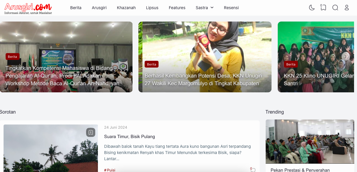 Situs arusgiri.com memang disiapkan bagi jurnalis mahasiswa LPM Spektrum. Tujuannya untuk menumbuhkan dan mengembangkan semangat jurnalisme kampus. Setiap hasil tulisan mereka diunggah di website agar keberadaan LPM semakin eksis. Sekaligus ini untuk mengajak mahasiswa yang lainnya untuk terus berkarya.